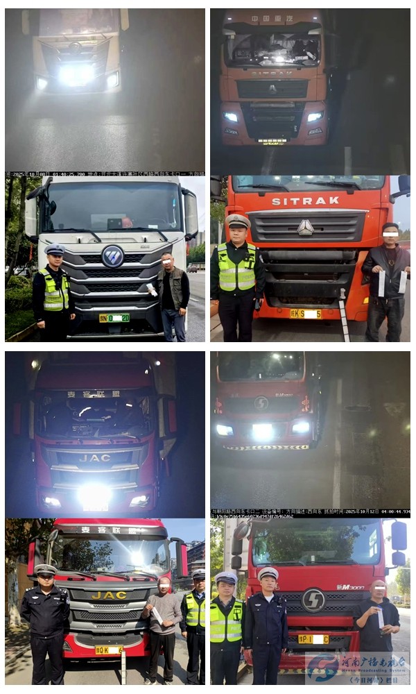 本网讯(白俊峰)大货车私自加装射灯、违规使用远光灯等交通违法行为,严重威胁道路交通安全。根据周口市公安局交警支队统一部署,自10月起,直属二大队针对货车非法加装射灯、故意遮挡号牌等行为开展专项整治,成功查处4起跨区域违法案件,形成有效震慑。