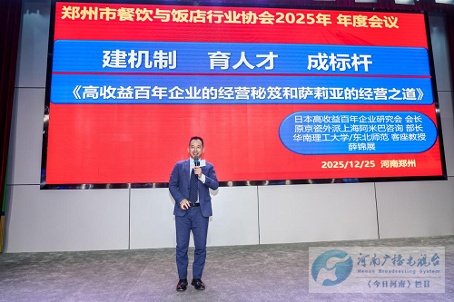 12月25日,在郑州市餐饮与饭店行业协会2025年会现场,日本高收益百年企业研究会会长、京瓷集团原部长、华南理工大学商学院客座教授薛锦展老师以《高收益百年企业的经营秘笈和萨莉亚的经营之道》为主题,给大会现场的餐企代表带来了一场融合国际智慧与行业实践的深度分享,为郑州餐饮业高质量发展注入“他山之石”。