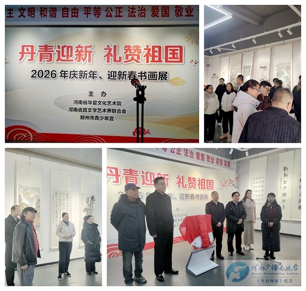 12月29日上午,“丹青迎新 礼赞祖国——2026年庆新年、迎新春书画展”在郑州市青少年宫正式拉开帷幕。本次展览由河南省华夏文化艺术院、河南省直文学艺术界联合会、郑州市青少年宫联合主办,旨在以书画艺术为载体,弘扬中华优秀传统文化,表达对祖国的深情礼赞,营造喜庆祥和的新春氛围。