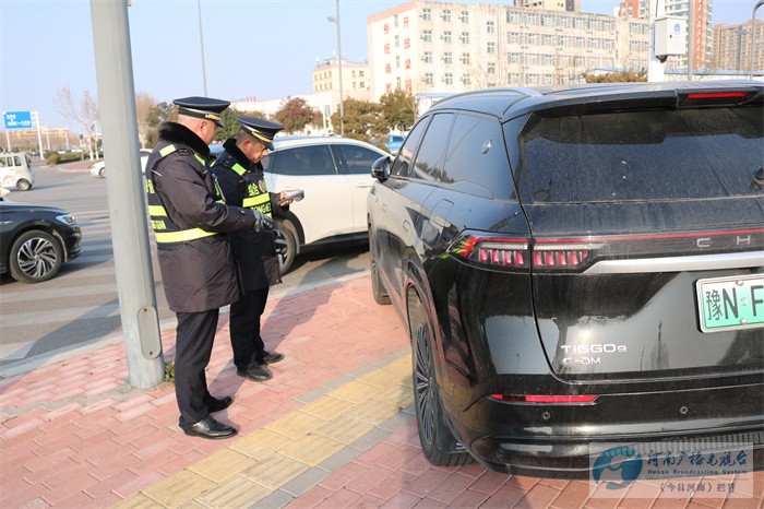 当日9时28分,执法队员在胜利路与人民路交叉口东北角巡查时发现,一辆车牌为豫NFXXXX的黑色机动车违规停放在人行道上,且存在占压盲道的行为。依据《中华人民共和国道路交通安全法》《中华人民共和国道路交通安全法实施条例》《中华人民共和国行政处罚法》及《中共河南省委 河南省人民政府关于深入推进城市执法体制改革改进城市管理工作的实施意见》(豫发〔2016〕36号)等相关规定,执法队员立即对该违停车辆进行拍照取证,并依法下达《温馨提示单》,这也是梁园区城管局针对人行道机动车违停开出的首张提示单。