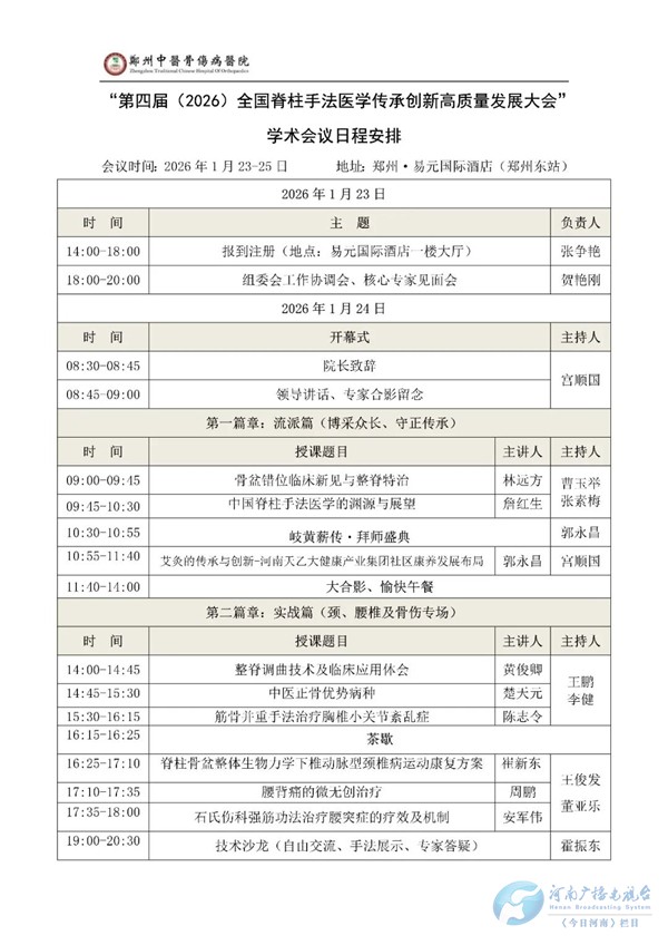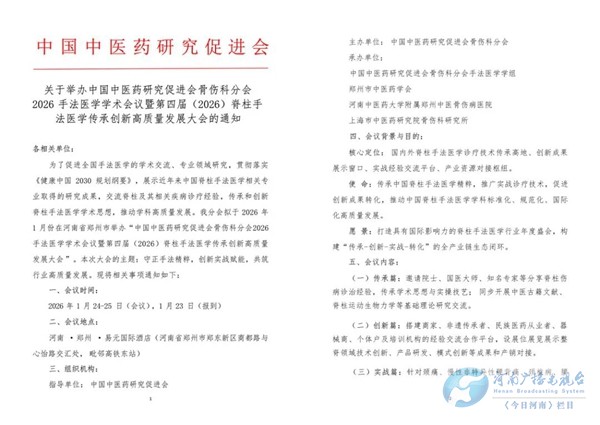 为了促进全国手法医学的学术交流、专业领域研究,贯彻落实《健康中国 2030 规划纲要》,展示近年来中国脊柱手法医学相关专业取得的研究成果,交流脊柱及其相关疾病诊疗经验,传承和创新脊柱手法医学学术思想,推动学科高质量发展。中国中医药研究促进会骨伤科分会拟于 2026年1月23日-25日在河南省郑州市举办“中国中医药研究促进会骨伤科分会2026手法医学学术会议、郑州市中医药学会整脊专委会成立大会暨第四届(2026)全国脊柱手法医学传承创新高质量发展大会”。