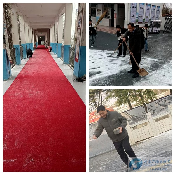 险情就是命令,行动彰显担当。南召现代中学的领导们闻雪而动,第一时间带领同学们和志愿者们投入到铲雪除冰行动中。凛冽的寒风中,党员干部们冲锋在前,充分发挥模范带头作用,挥舞着铁锹、扫帚,一点点清理着路面的积雪与坚冰;同学们也不甘示弱,纷纷加入队伍,有的铲雪、有的扫雪,一张张年轻的脸庞在风雪中格外耀眼,这也是南召现代中学五育并举的一大体现。与此同时,学校总务处迅速响应,及时在光滑路段铺上防滑红毯,并撒盐除冰,为师生们筑起一道安全屏障。寒风刺骨,却挡不住大家同心协力的热情;冰雪难行,却隔不断互帮互助的温暖。这场与冰雪的较量,不仅清理了校园道路,更凝聚了全校师生的向心力,展现了团结一心、迎难而上的自强精神。