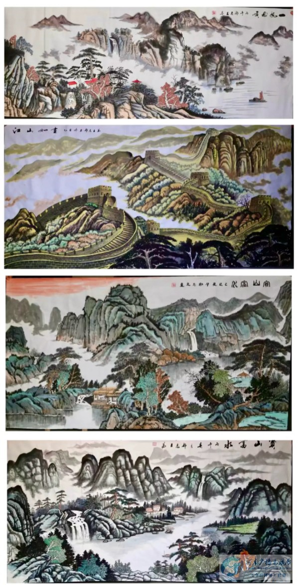 山为“龙脉”象征根基稳固,水为“财源”代表财富滚滚。郭志臣的山水画,既有北方山水的雄浑壮阔,又有南方山水的秀雅灵动。《春夏秋冬》《漓江秋色》等作品,以娴熟的笔墨技法,勾勒出山川的巍峨、云雾的缥缈、林木的葱郁、水流的澄澈。他注重意境营造,远近虚实相映,笔墨干湿互用,让观者仿佛置身于静谧悠远的山水之间,既能感受到大自然的磅礴气势,又能体悟到返璞归真的宁静心境,尽显东方山水的诗意与哲思。