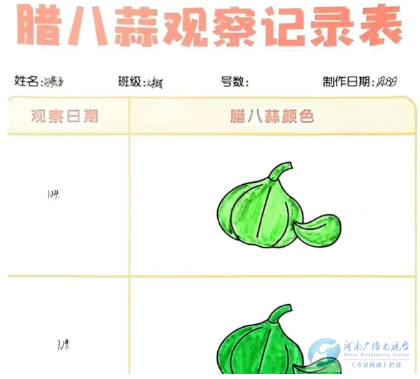 泡腊八蒜是一道主要流行于北方,尤其是华北地区的传统小吃,是腊八节节日食俗。将剥了皮的蒜瓣儿放到一个可以密封的罐子,瓶子之类的容器里面,然后倒入醋,封上口放到一个冷的地方。慢慢地,泡在醋中的蒜就会变绿,最后会变得通体碧绿的,如同翡翠碧玉。在这个过程中,同学们把腊八蒜变化的过程记录了下来。