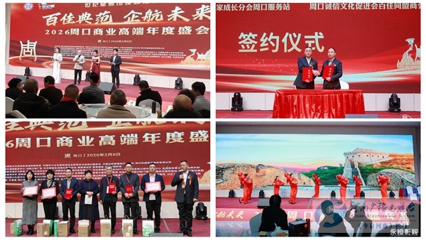 本网讯(白俊峰)2月8日,由周口市诚信文化促进会百佳同盟商会与中国中小企业协会企业家成长分会周口服务站联合主办的“百佳典范 企航未来 2026周口高端年度盛会”隆重举行。两家会员商家企业代表、合作伙伴、媒体嘉宾齐聚一堂,共叙情谊、共商合作、共谋发展,在喜庆祥和的氛围中,擘画新时代民营经济高质量发展新蓝图。