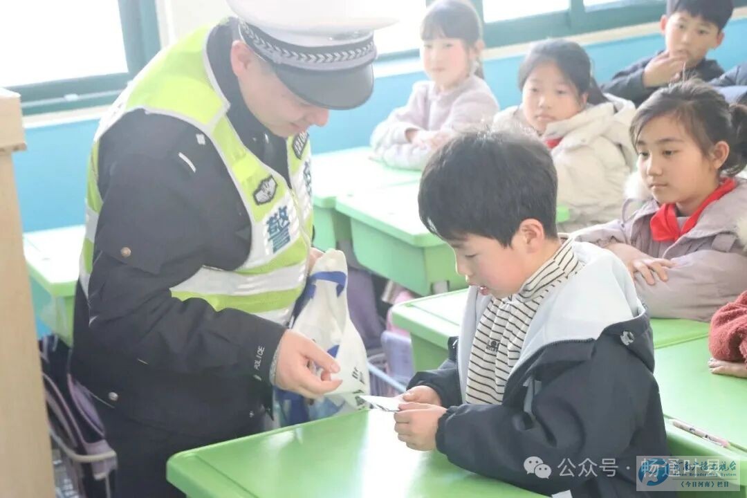 宣讲尾声,民辅警们化身暖心“宣传员”,为每位同学递上印制的交通安全宣传单,并叮嘱道:“回家要和家长一起读一读宣传单,把今天学到的安全知识讲给家人听,以学生带动家庭、以家庭辐射社会,筑牢道路交通安全的坚固防线。”