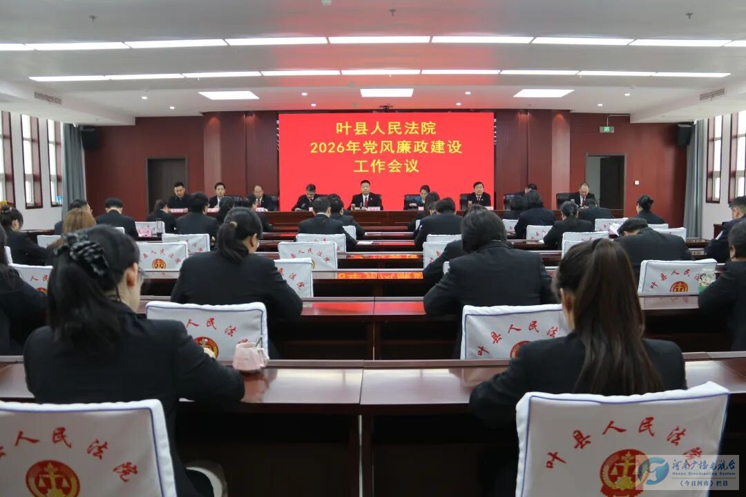 3月23日下午,叶县人民法院召开2026年度党风廉政建设工作会议。院党组书记、院长郭国会出席会议并讲话,县纪委监委第五纪检监察室主任王素平到会指导。会议由院党组副书记、副院长温世举主持,全体干警参加会议。