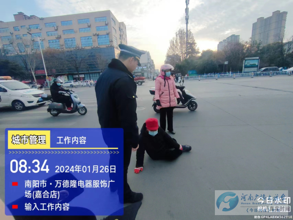 1月26日在卧龙区光武街道兴达巷人民路口发生暖心的一幕,一名老人摔倒,恰巧被正在巡逻的光武街道城管中队执法队员发现,执法队员及时上前将老人扶起,耐心询问老人受伤情况,在确认老人没有大碍后,才让老人自行离开。