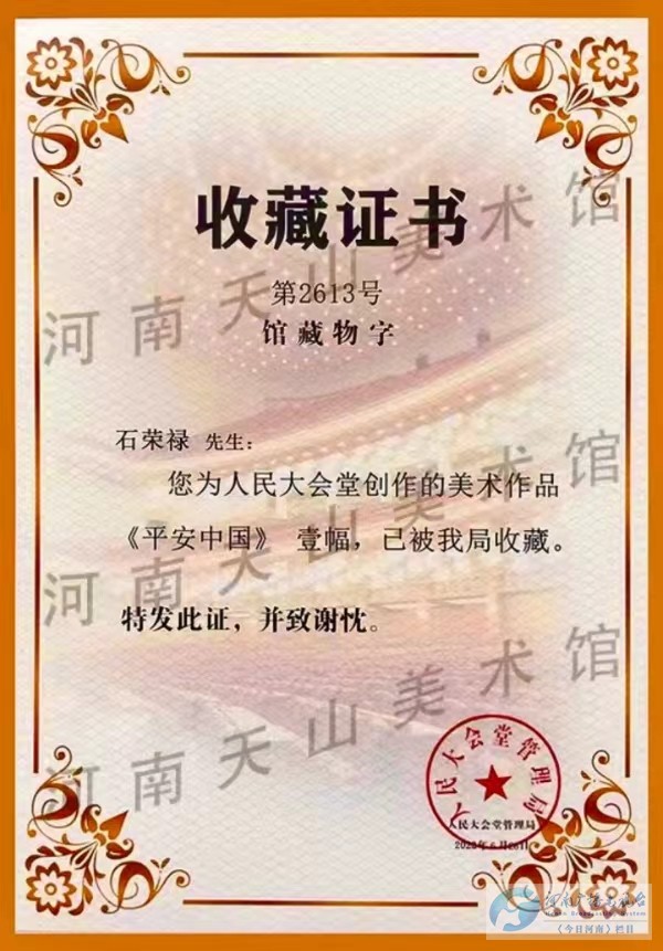“人民大会堂”,是中国全国人民代表大会开会地和全国人民代表大会常务委员会的办公场所,是党、国家和各人民团体举行政治活动的重要场所,也是中国党和国家领导人和人民群众举行政治、外交、文化活动的场所。人民大会堂每年举行的全国人民代表大会、中国人民政治协商会议以及五年一届的中国共产党全国代表大会也在此召开。当代知名画家石荣禄先生的杰作《平安中国》能在此收藏,不但是一位画家以书画艺术的形式,对伟大祖国的热爱和平安祝福,也彰显了他的绘画艺术的博大精深。
