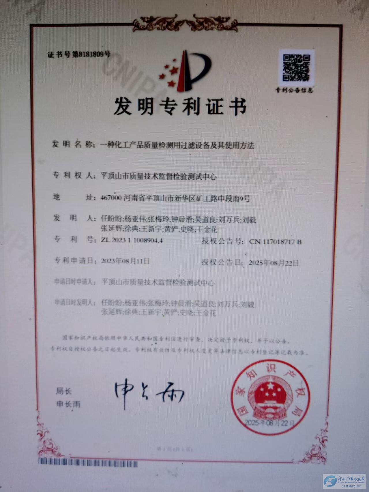 10月11日,从平顶山市产品质量检验检测中心传来喜讯,该中心在科研领域取得重要突破,其能源化工产品检验研究所申报的发明专利《一种化工产品质量检测用过滤设备及其使用方法》(专利号:ZL202311008904.4)近日正式获得国家知识产权局授权。这一成果标志着该中心在化工产品质量检测技术研发方面取得了新突破,也为省级能源及尼龙化工产品质量监督检验中心的建设提供了有力支撑。