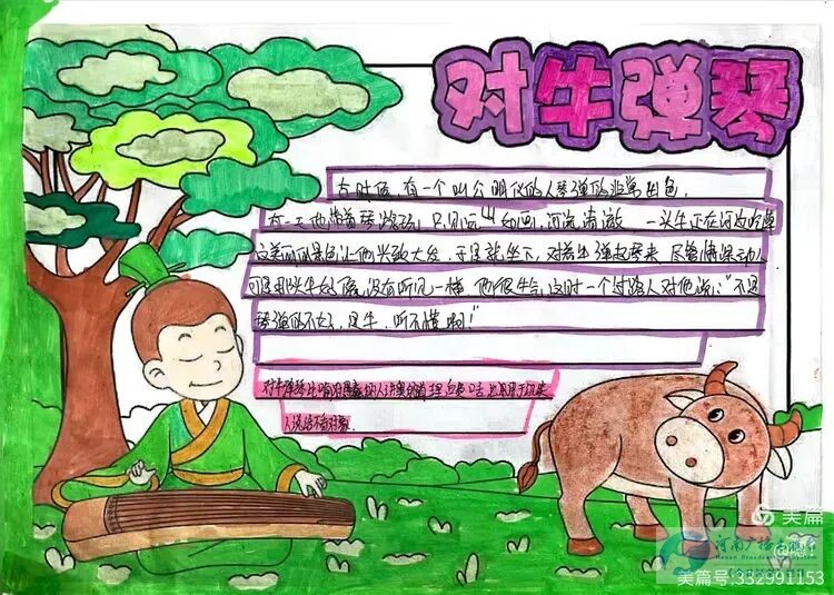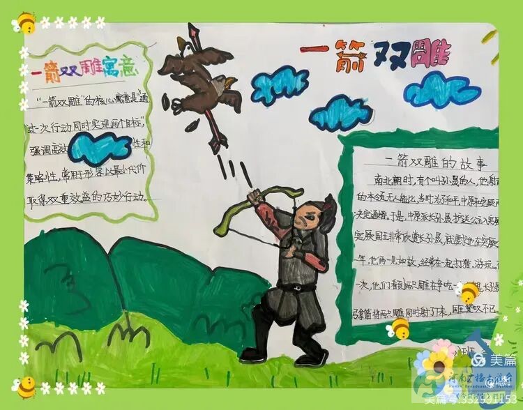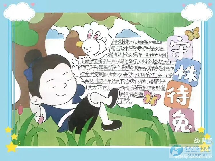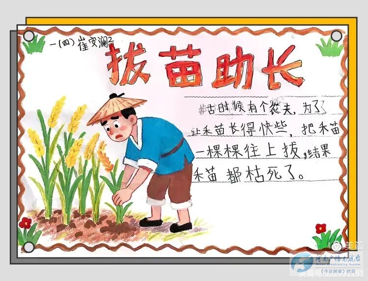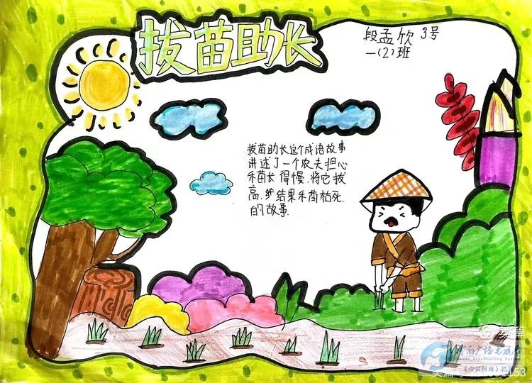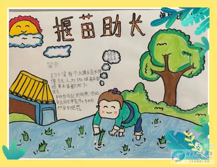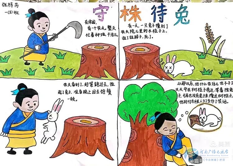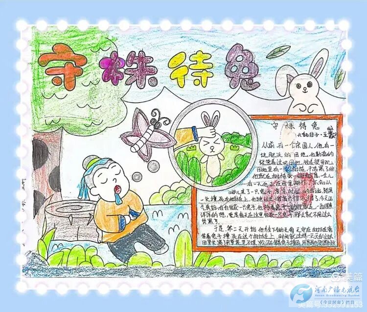 笔尖流转间,经典故事有了具象的模样。有的同学将“拔苗助长”的急切绘于纸上,墨色里藏着违背规律的警示;有的用明快色彩勾勒“守株待兔”的画面,幽默笔触中暗喻着务实的道理;让智慧之光在画纸上静静流淌。每一份手抄报,都是同学们对故事的独特解读——不是简单的情节搬运,而是用色彩与创意,让千年典故在当下焕发新的生命力。