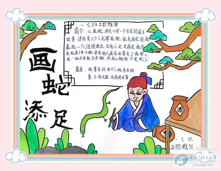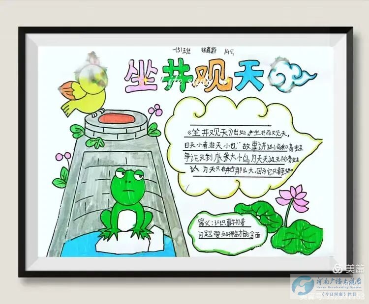 如果说手抄报是静态的对话,那小视频便是动态的演绎。镜头前,同学们化身“故事角色”:有同学用生动的旁白讲述“守株待兔”的故事;也有小组通过情景剧再现“坐井观天”的局限,用夸张的表演点出“眼界”的重要;更有同学以动画形式拆解“画蛇添足”,让抽象的“多余之举”变得直观有趣。这些小视频没有华丽的特效,却用真诚的表达,让经典故事从书页中“走”出来,成为可看、可感、可传播的文化片段。