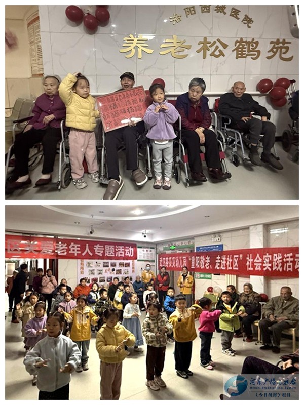 为弘扬中华民族爱老敬老的优秀传统美德,营造尊老、爱老、助老的氛围,带着对老人的尊敬、关怀和爱戴,郑州路街道华源社区联合辖区武汉路贝贝幼儿园来到养老松鹤苑为老人们送上节日祝福,让敬老院的老人们过个温馨、快乐的重阳节。