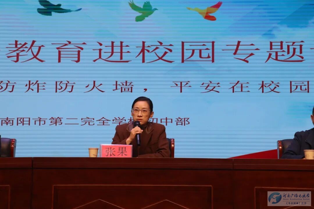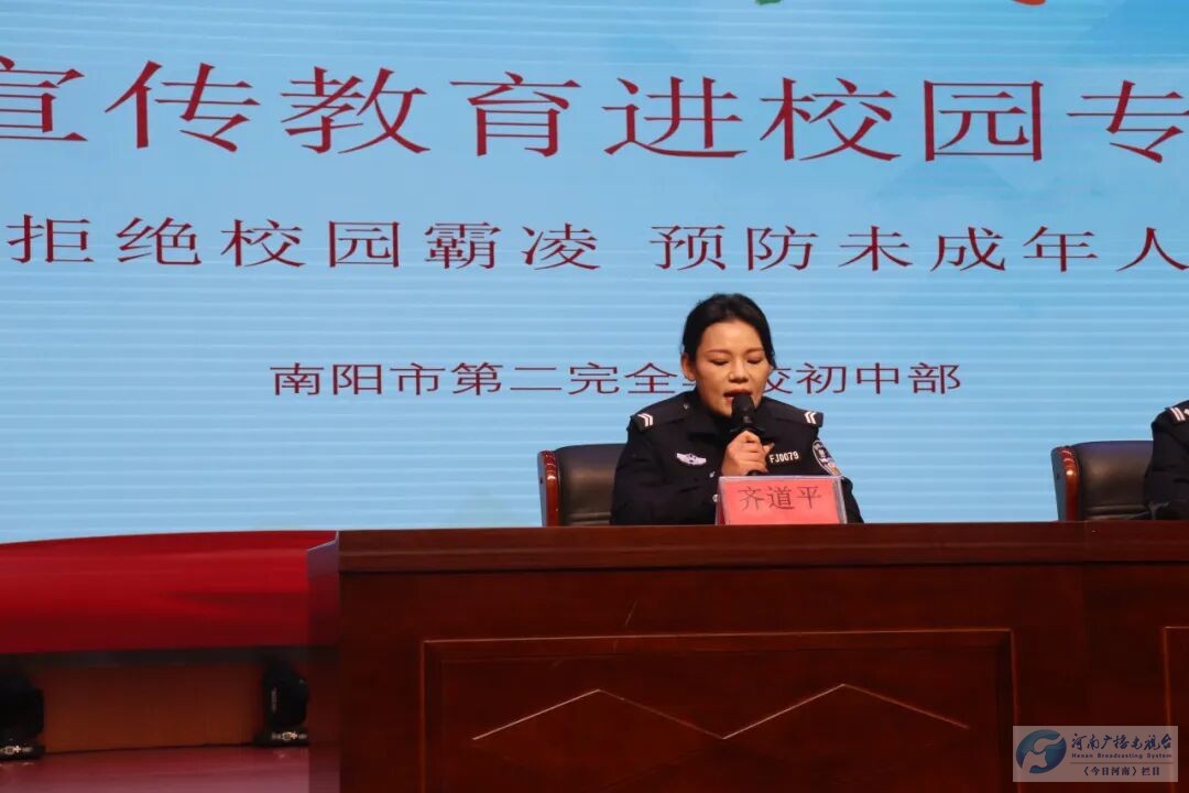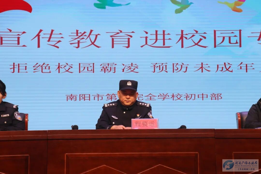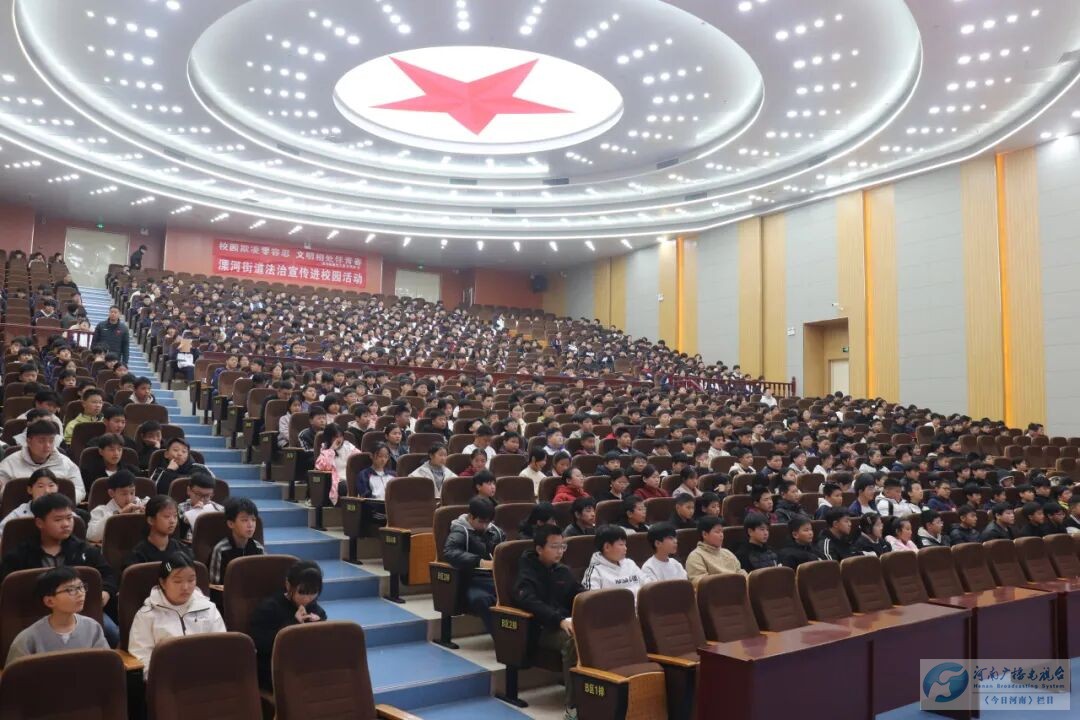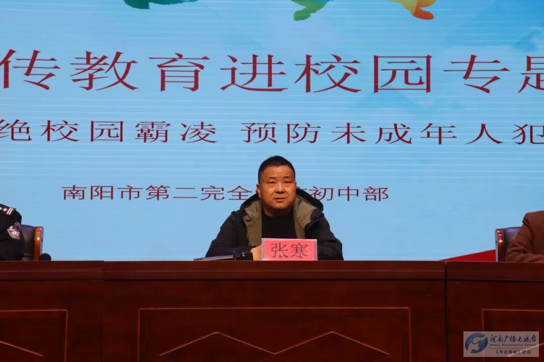 为筑牢校园安全防线,营造和谐、友善的学习环境,2025年11月13日,溧河街道综治办主任张寒、溧河司法所所长张果、溧河派出所民警程要远、齐道平、河南两相律师事务所包闻哲律师来到南阳市第二完全学校初中部,为全体师生带来一场主题为“校园欺凌零容忍 文明相处伴青春”的法治专题讲座。