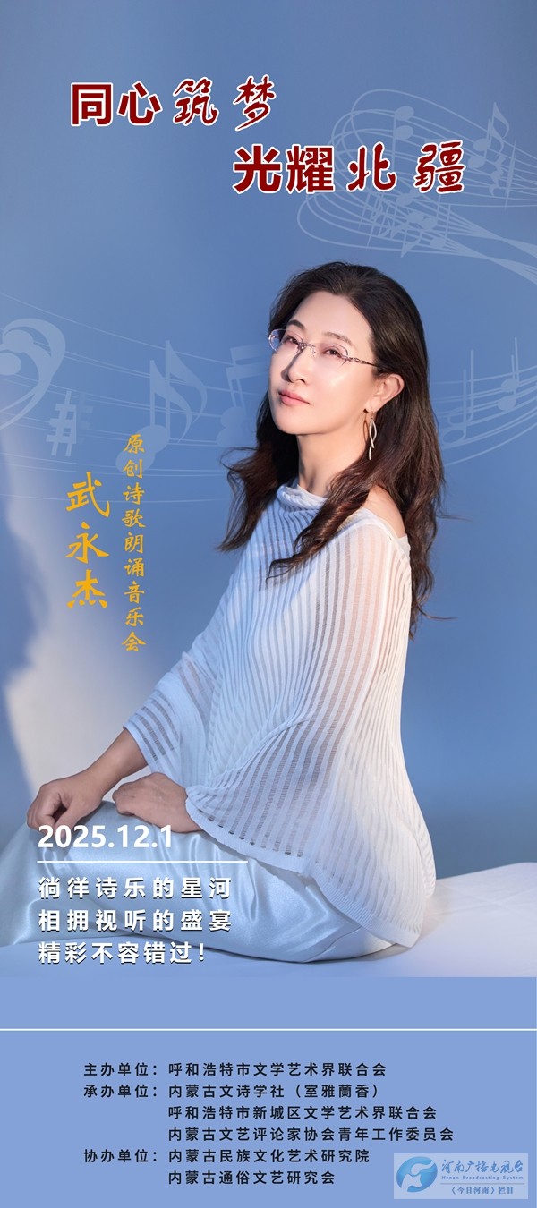 为深入贯彻党的二十届四中全会精神,全面贯彻习近平文化思想,由呼和浩特市文学艺术界联合会主办,内蒙古文诗学社(室雅蘭香)、呼和浩特市新城区文学艺术界联合会、内蒙古文艺评论家协会青年工作委员会承办,内蒙古民族文化艺术研究院、内蒙古通俗文艺研究会共同协办的 "同心筑梦. 光耀北疆"——2025年武永杰原创诗歌朗诵音乐会,将于2025年12月1日晚7点在呼和浩特市乌力格尔艺术宫精彩上演。