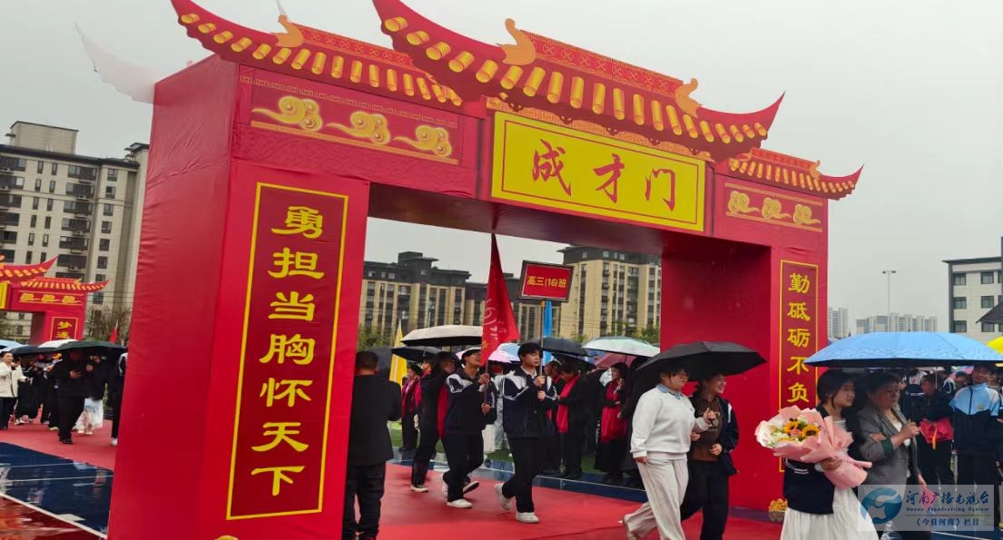 仪式迎来最高潮,细雨朦胧中,学子们牵起家长的手,步履坚定、意气风发,依次跨越“成人门”“成才门”“成功门”。