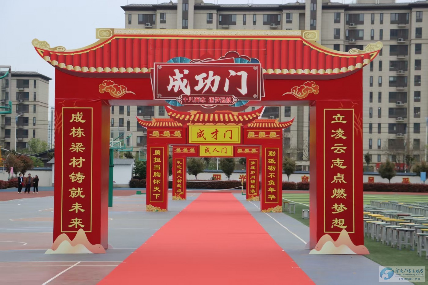 三道拱门寓意深远,串联起少年成长的完整轨迹:跨过成人门,告别稚气,扛起公民责任;迈过成才门,笃学精进,锤炼过硬本领;越过成功门,乘风破浪,奔赴理想前程。学子们笑容灿烂、目光坚定,家长们满眼欣慰、饱含期许,不少家庭在门前深情相拥,温暖的画面定格成永恒,成为青春里最珍贵的记忆。